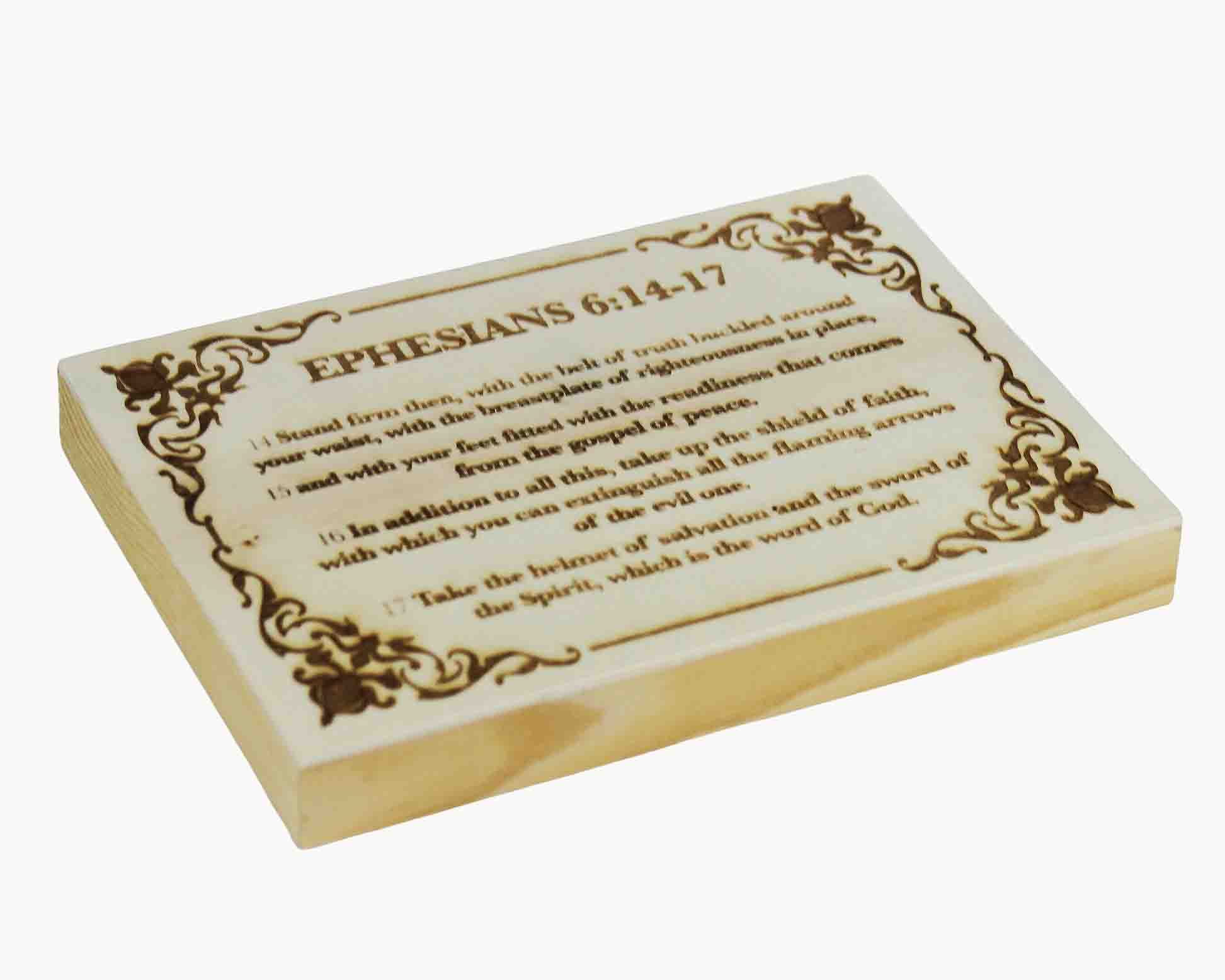 This 5x7 inch wood panel engraves the armor of God into natural grain, blending rustic elegance with spiritual strength.