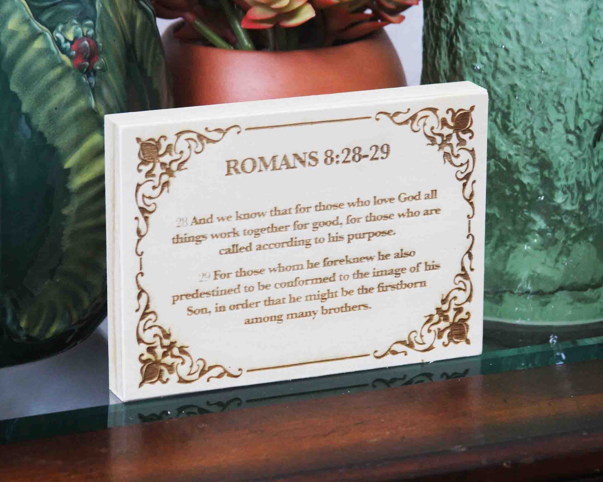 Romans 8:28–29, Engraved (5” x 7”) Wood Panel